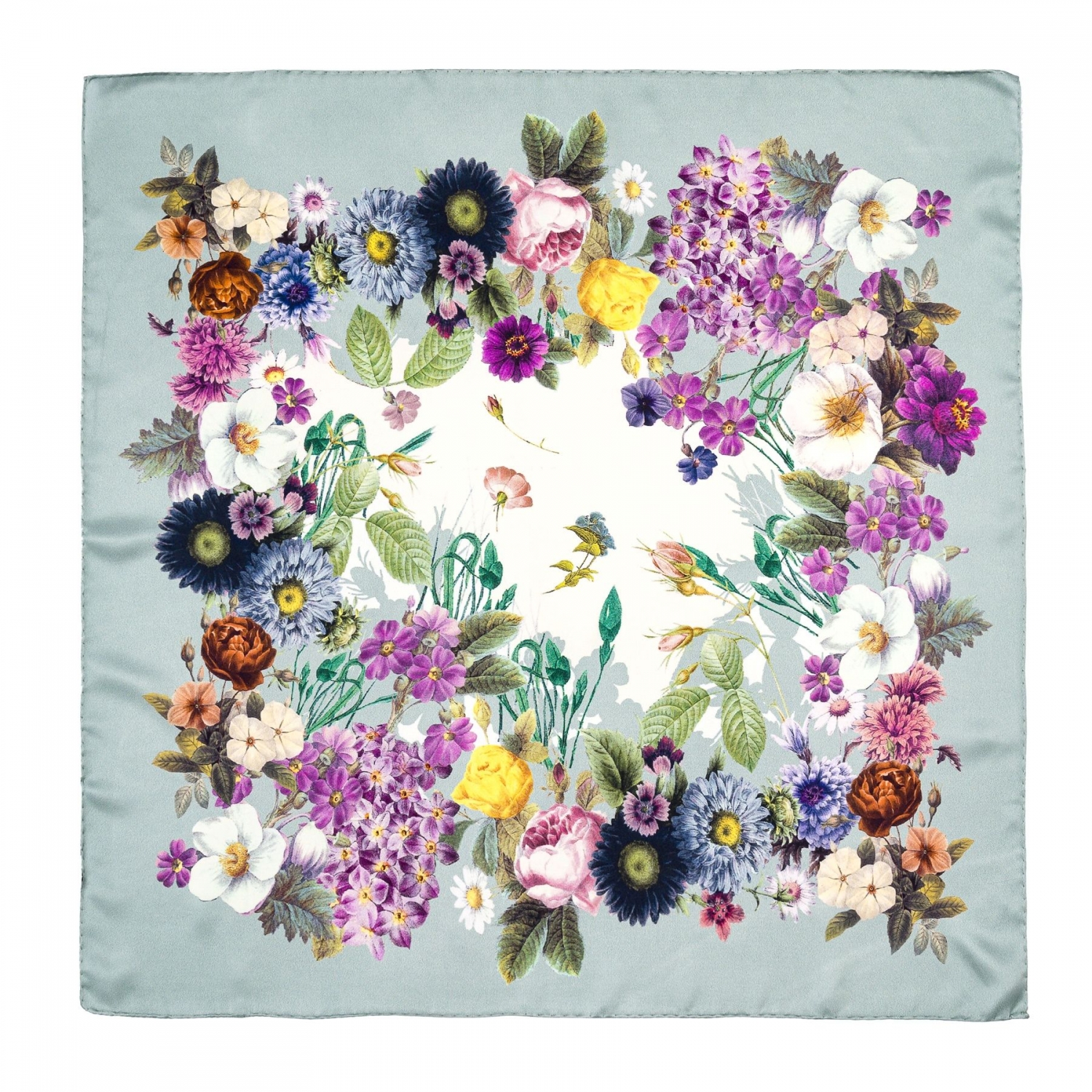 Gift Silk Scarf M Panier des Fleur Ming vert and Silver Earings with Uruguay agate, rose quartz, pearls