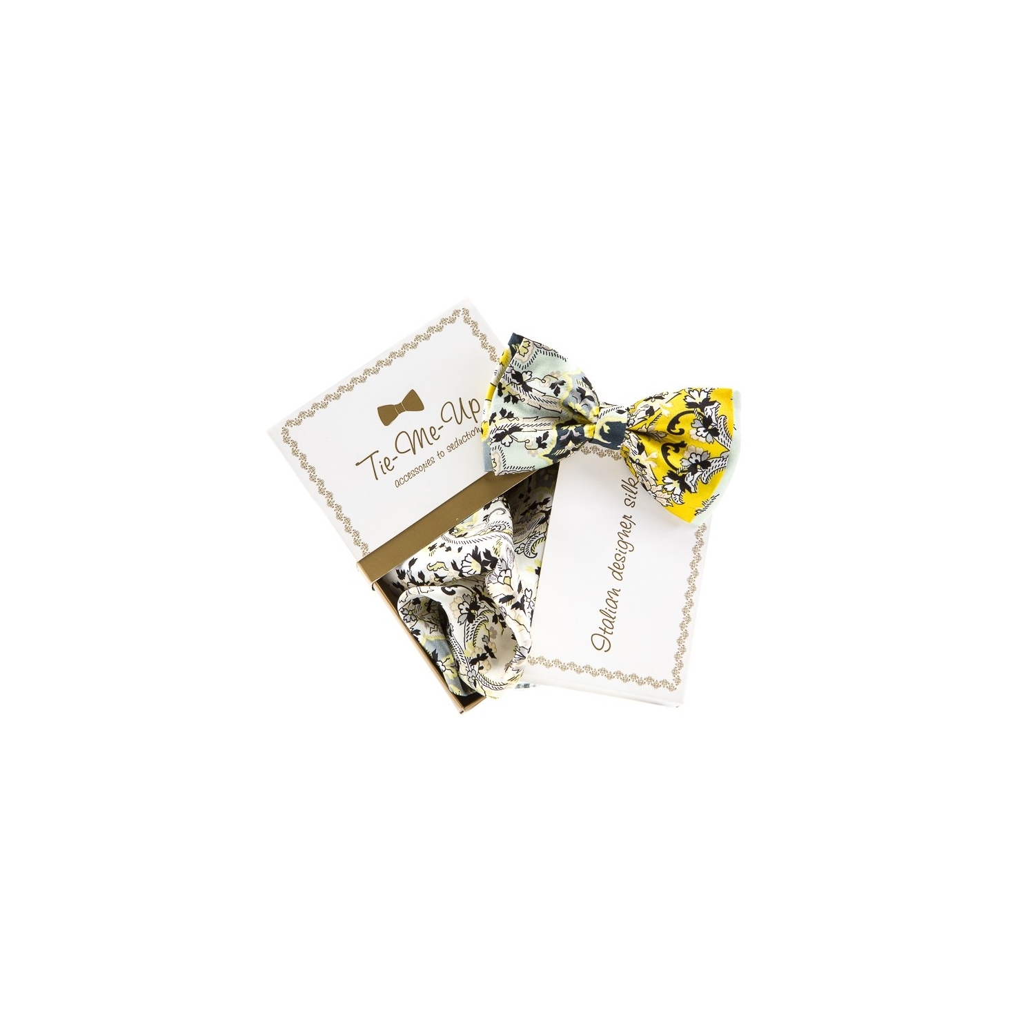 Luxury gifts for men: Set bow tie and handkerchief silk with paisley print in shades of gray and yellow, distinctive accessories that will make your outfit.