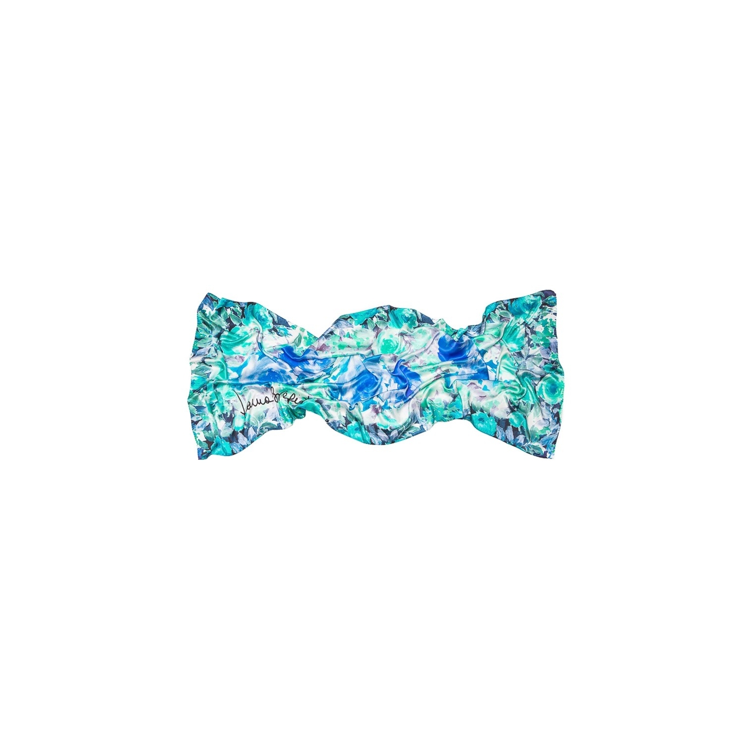 A special material and a print with a floral delight. Blu roses on silk, signed print by Laura Biagiotti.