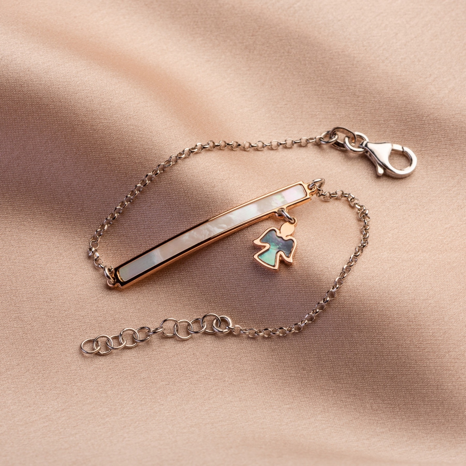 Silver bracelet in two colors, with pearl and silver angel charm. Made in Italy. Gift packaging.
