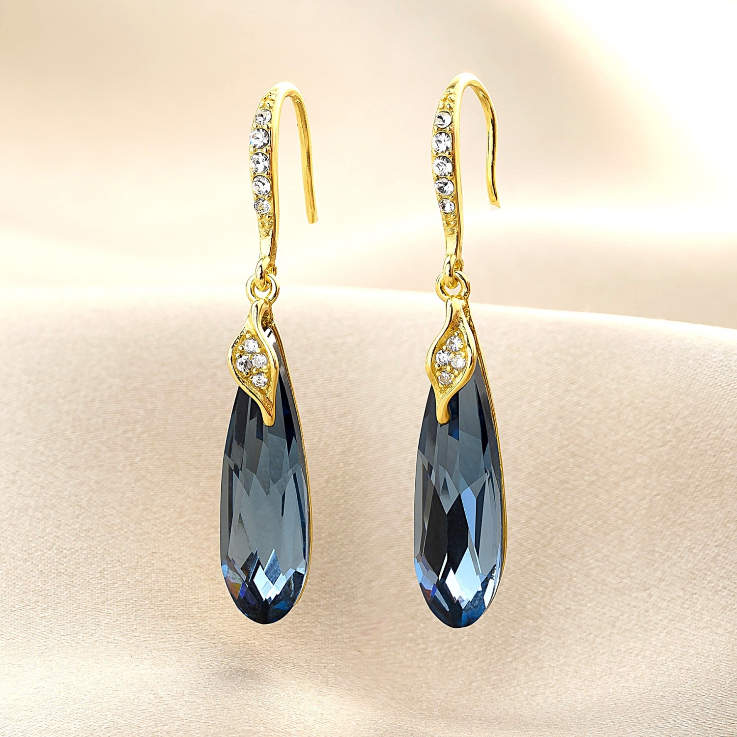 Cercei eleganti argintii cu pietre albastre si cristale aurii.