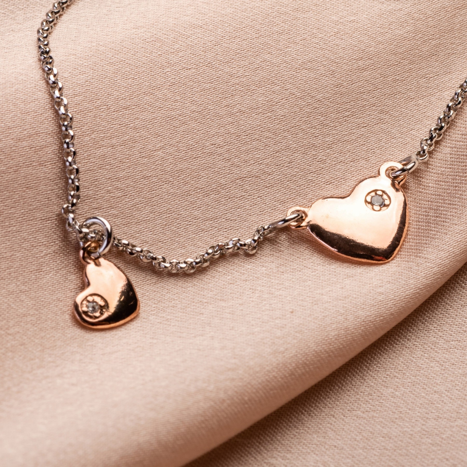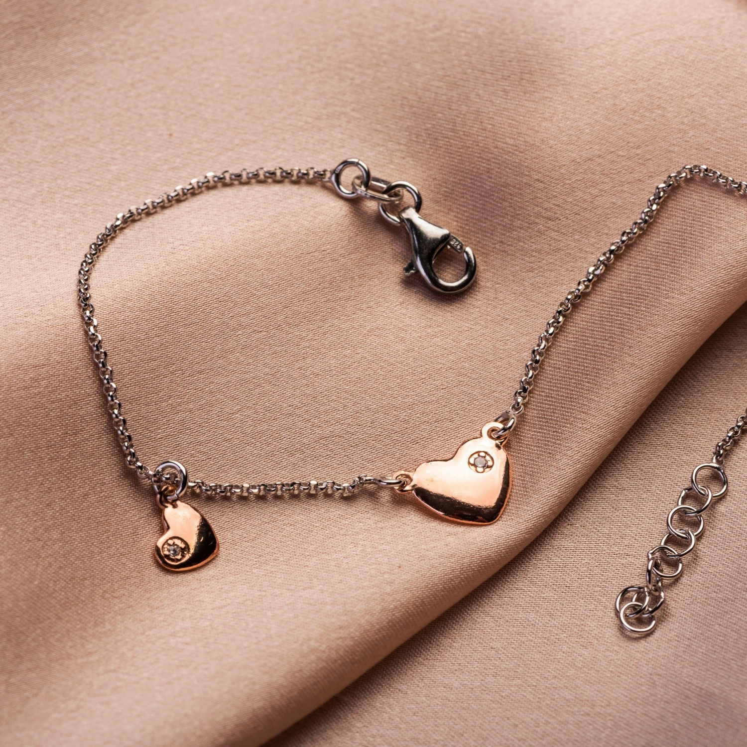 O combinatie moderna din doua culori de argint rodiat. Bratara fina cu charmuri in forma de inima si cu un mic stras de zirconia pe fiecare din ele. Charmul mare are o dimensiune de 1x1 cm. Charmul mic este culisant si are 0.6x0.6 cm. Bratara argint rodiat lucrata in Italia. Ambalare de cadou.