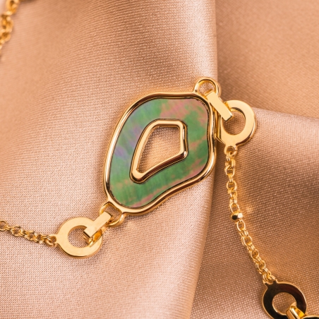 Cu un model deosebit, bratara din argint Confidence gold, este o piesa de colectie, o bijuterie rafinata care va transforma o intreaga tinuta. Bratara Confidence gold, din aceasta colectie exclusiva Tie-Me-Up, este realizata din argint rodiat 925 placata in nuanta aurie, de calitate premium, cu un design contemporan-urban, geometric, din sidef verde in montura de argint.