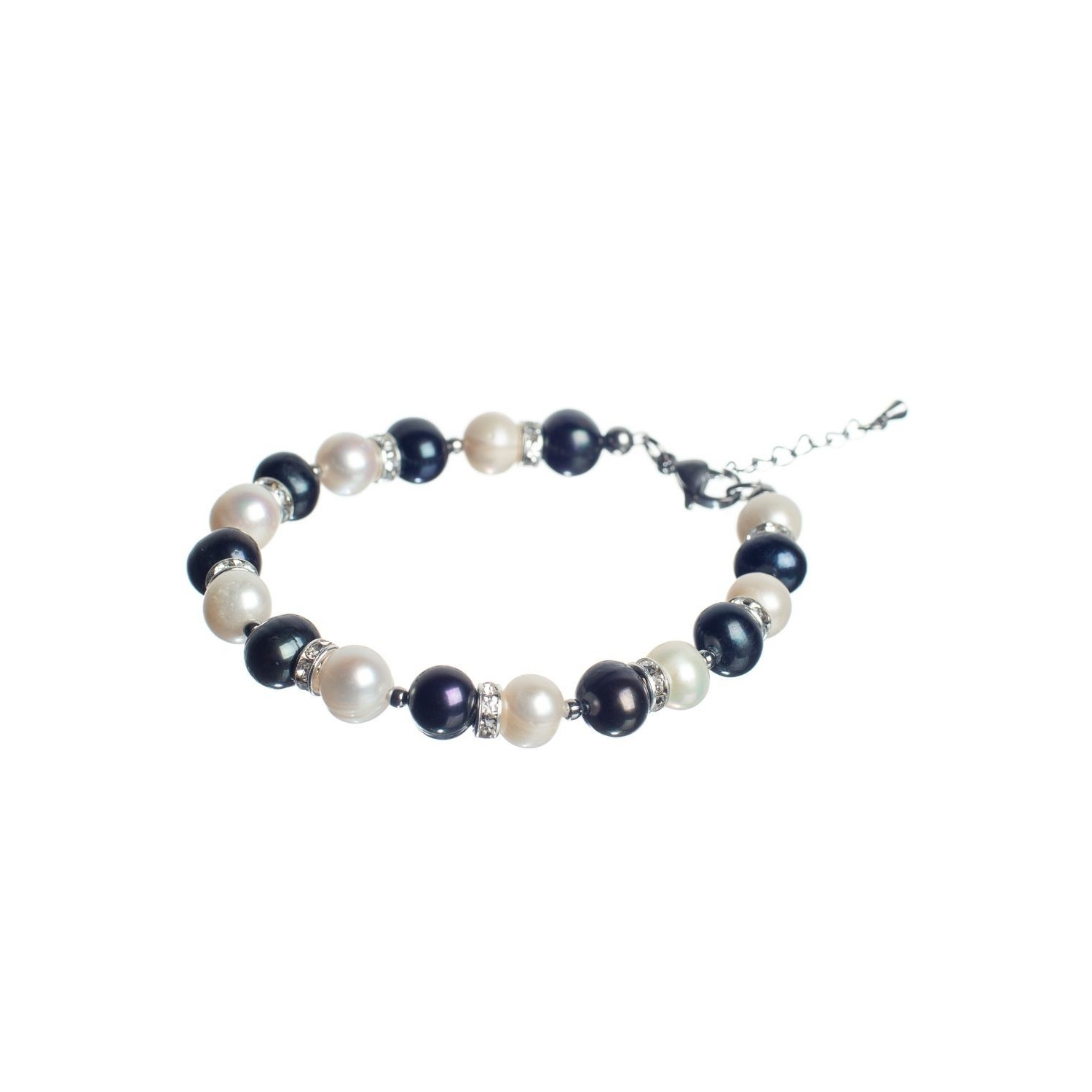 Set Bratara perle de cultura albe si negre si cercei argint cu perle albe si negre