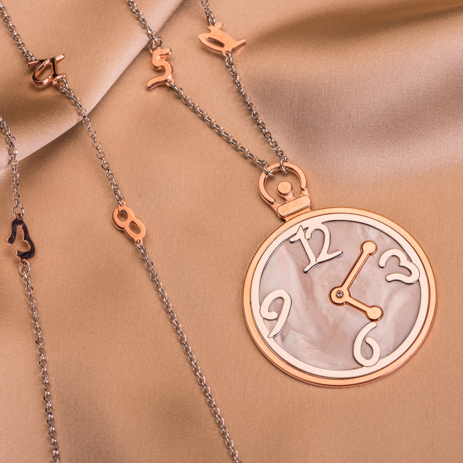 Colierul din argint rodiat Enjoy Time are un design modern, deosebit, potrivit pentru o tinuta lejera de zi sau de ce nu, de club. Colierul, din aceasta colectie exclusiva Tie-Me-Up, este lucrat in Italia, din argint rodiat 925 in culoare roz (rose) cu charmuri cifre si un pandant de 4 cm diametru sub forma unui cadran de ceas. Colierul Enjoy Time este pregatit intr-o frumoasa cutie de bijuterii.