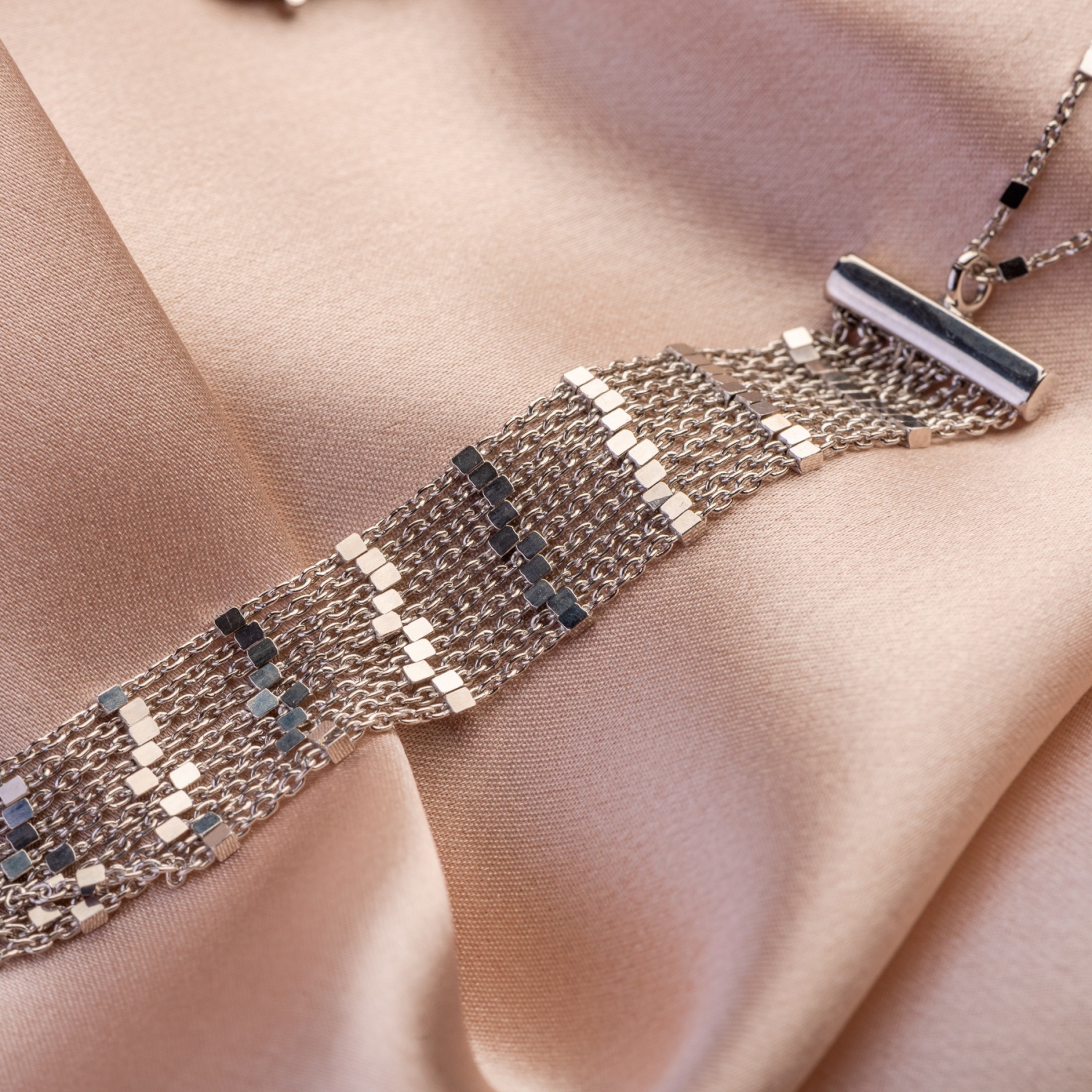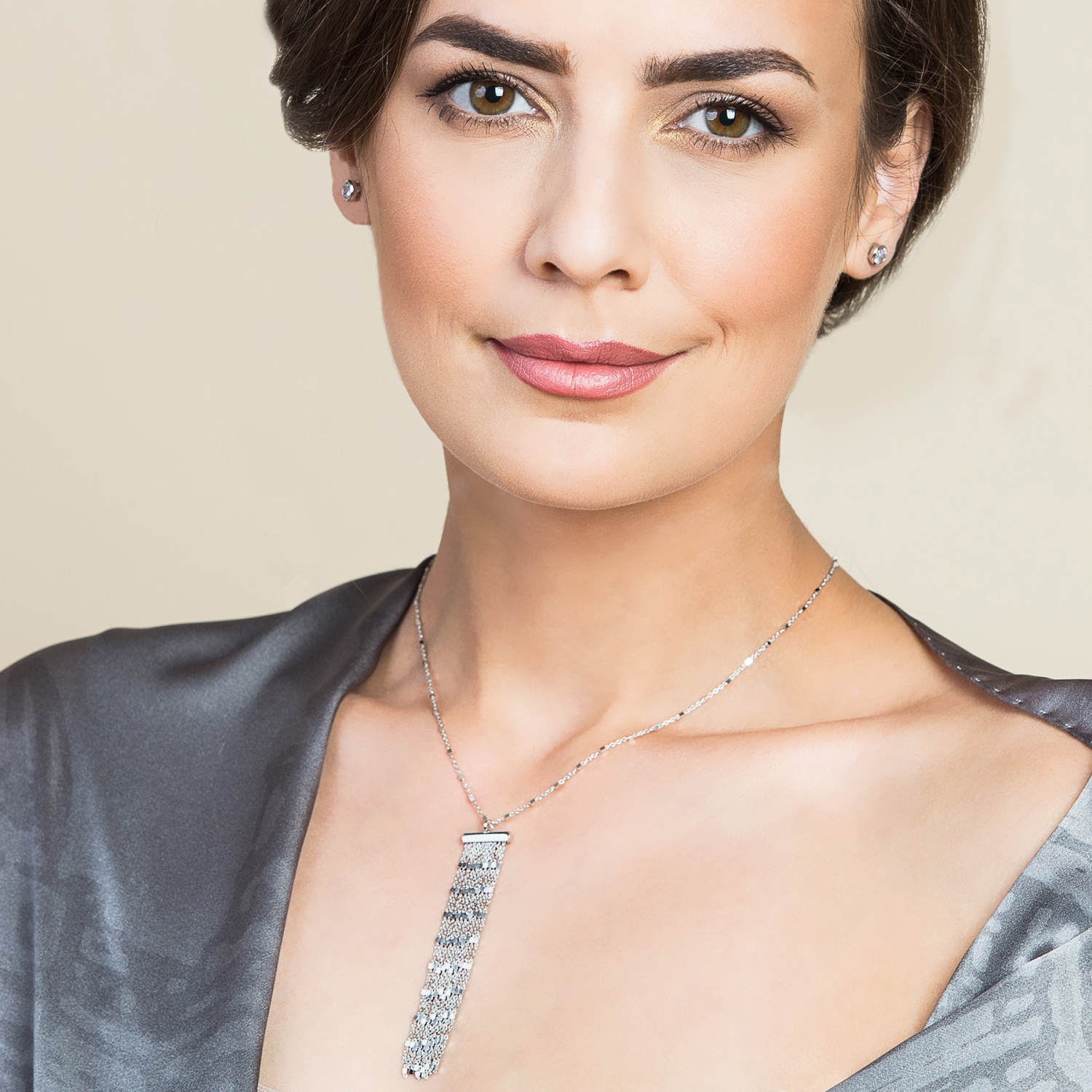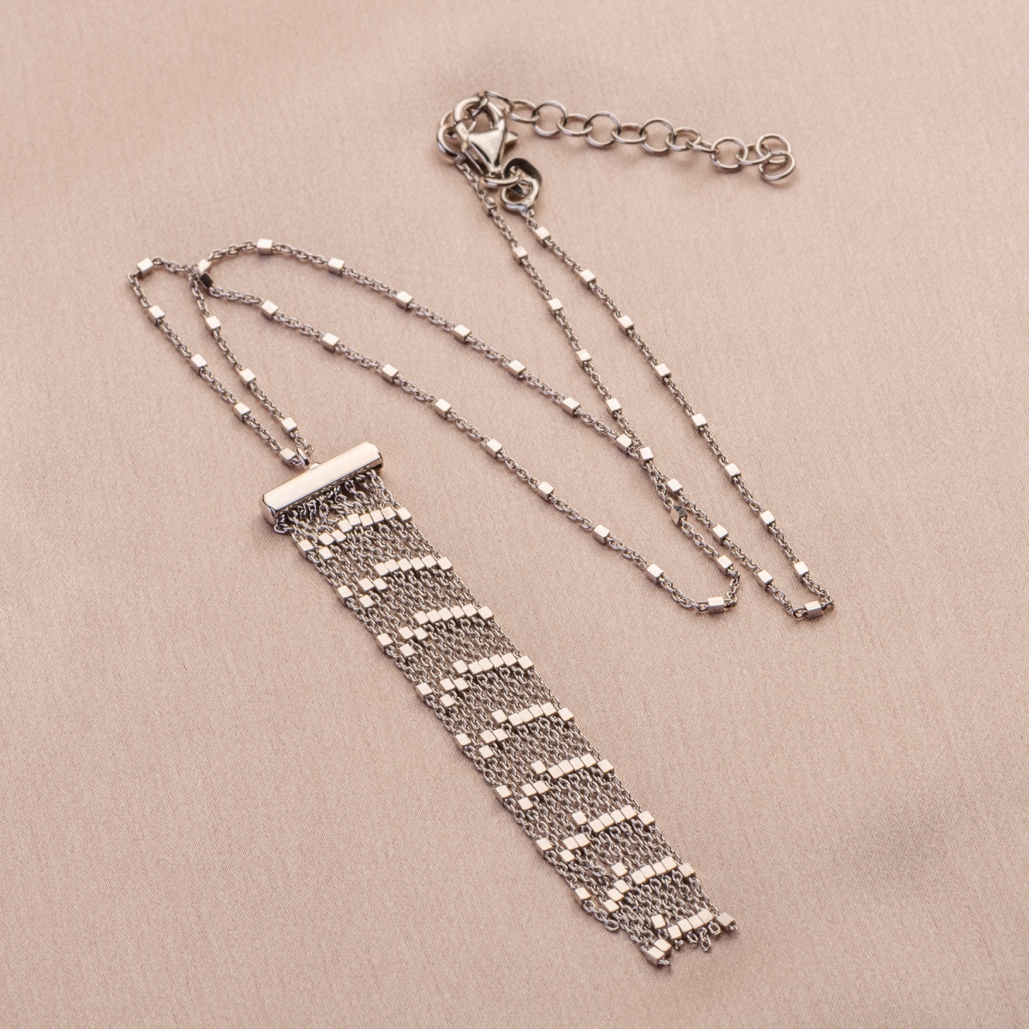O bijuterie deosebita, pentru o aparitie eleganta! Colierul din argint rodiat este lucrat in Italia. Elementul central este realizat din franjuri de argint cu lungimea de 7 cm, iar lantisorul de argint are 40 cm. Ambalare de cadou.