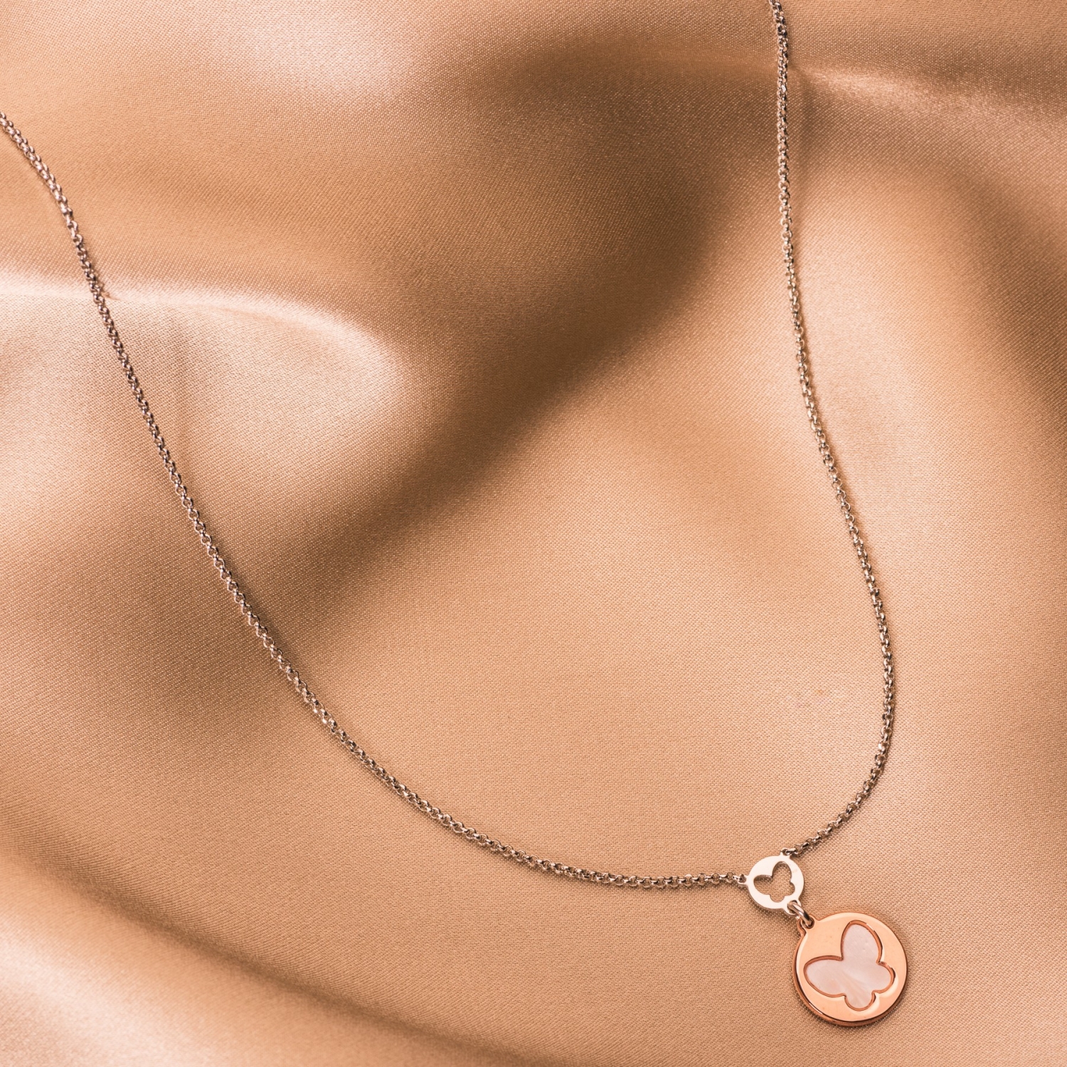 Colierul din argint Minimal Butterfly white este un cadou potrivit pentru prietena ta romantica. Colierul este lucrat in Italia, din argint rose (roz) si sidef alb, de calitate premium si are charm in forma de fluture. In exclusivitate la Tie-Me-Up, colierul din argint Minimal Butterfly white este pregatit intr-o cutie frumoasa de bijuterii, cu certificat de calitate si garantie si punga de cadou.