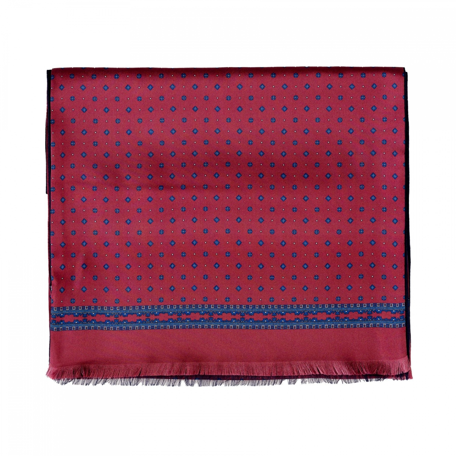 Esarfa din matase si lana barbati Uomo Florenta bordeaux, finisata impecabil, este alegerea ideala pentru o tinuta masculina eleganta. Esarfa este dubla, cu una din fete din matase naturala twill cu print bleumarin, geometric si cu fata interioara din tesatura de calitate, bleumarin, de lana. Alege din colectia Uomo Florenta, un accesoriu distins, perfect pentru un cadou special!