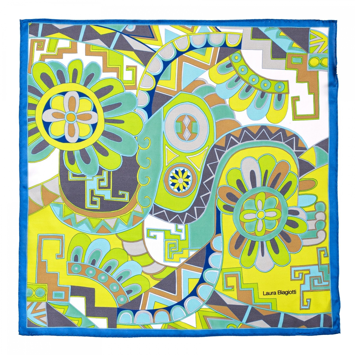 Aceasta esarfa din matatase naturala din colectia  Kisses from Capri se remarca prin tipare geometrice complicate, dar iluminate de maiestria imbinarii culorilor. Un design recognoscibil in intreaga lume, al lui Emilio Pucci, acum reinterpretat de Laura Biagiotti. Esarfele de acest tip pot accesoriza si o poseta sau se pot purta in par sau ca o bratara, ajutandu-te astfel sa creezi o continuitate cromatica de efect cu pantofii sau geanta preferate.