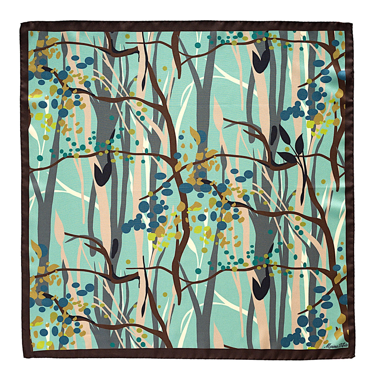 Descoperiti Esarfa matase S twill Unforgettable green, un accesoriu elegant si versatil, fabricat in Italia. Cu un design abstract unic de Marina d'Este si culori vibrante (maro, bej, vernil), aceasta esarfa din matase naturala twill, dimensiune 50x50 cm, adauga rafinament oricarei tinute. Ambalata impecabil de Tie-Me-Up, este cadoul perfect.